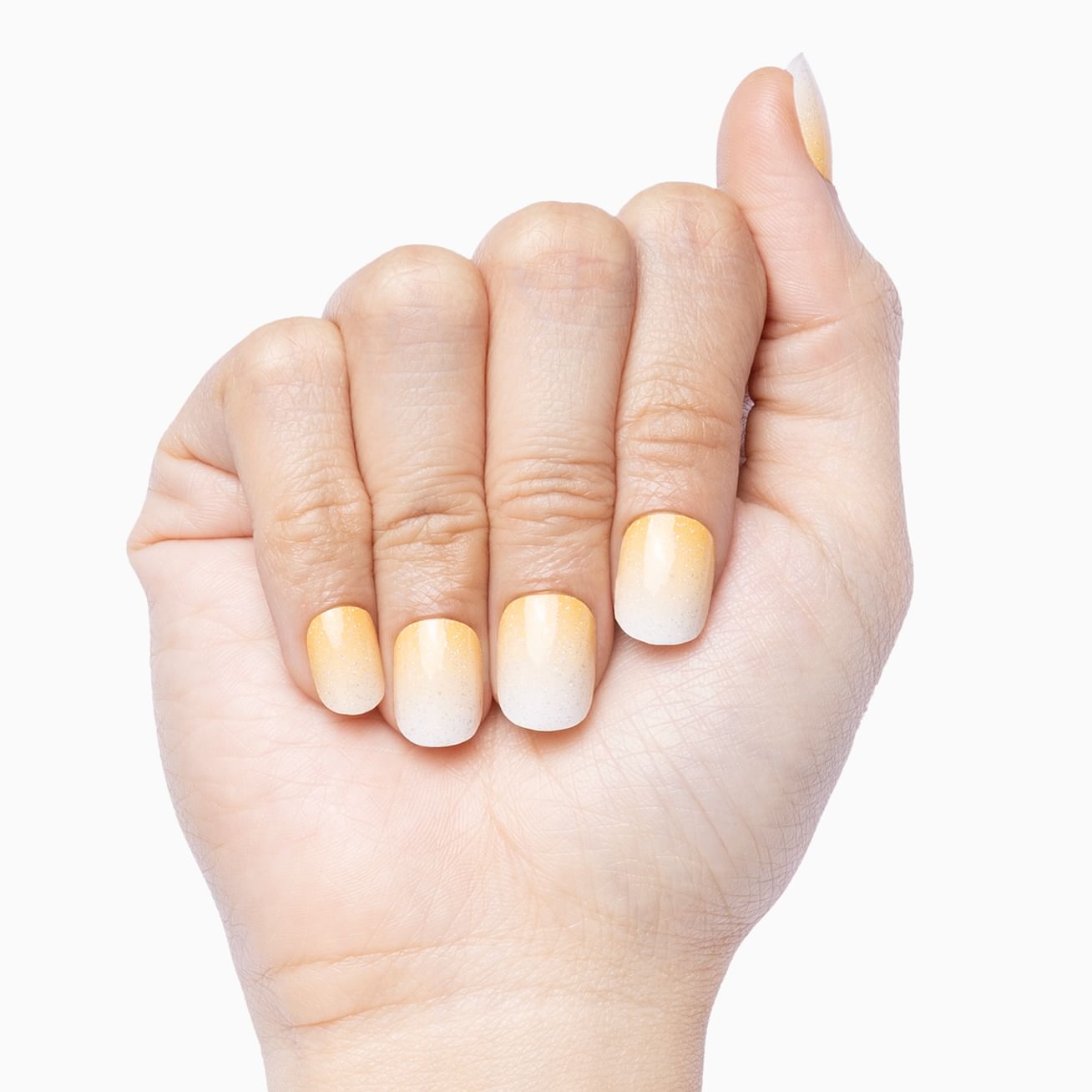Champagne Kisses is the perfect mixed fall manicure in glossy oranges, yellows, grays, and cream, with a peck of gold glitter hugging your cutie-cles. To extend the embrace of this already long-lasting, easy-to-apply manicure, add a base and top coat.Β