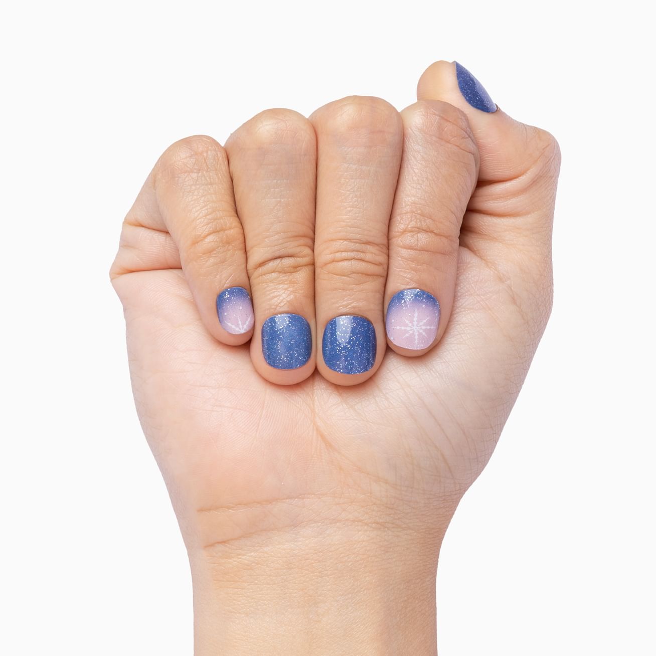 Let your fingertips pirouette into a winter dream with Sugarplum Fairy. Soft, silvery glitter is sprinkled over dreamy sold blue is paired with a delicate ombré design that kisses the cuticle with just a whisper of blue that fades into ballet-slipper pink with dainty white snowflakes. These wraps feel like a fairytale dancing across your nails - graceful, frosty, and full of holiday magic.