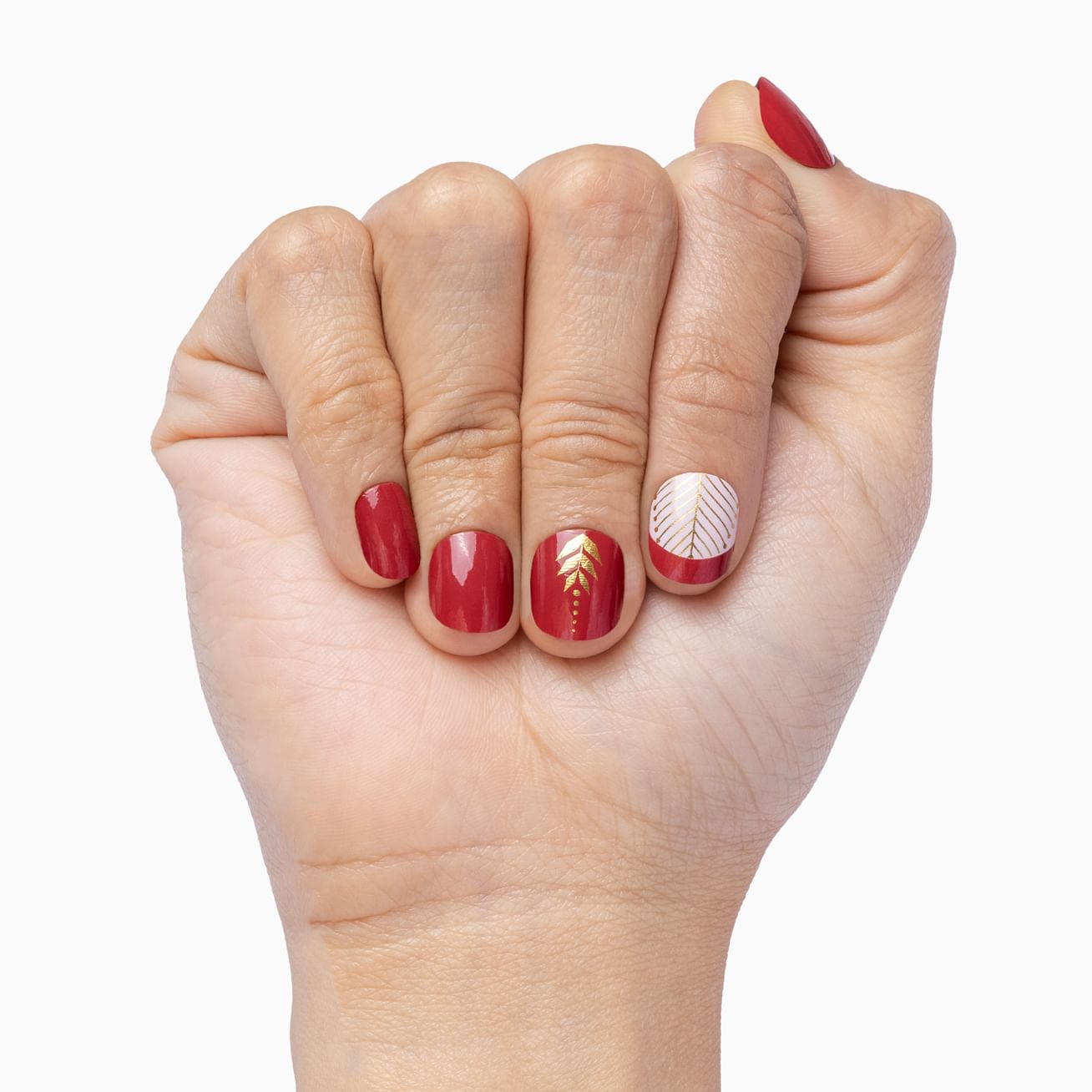 You'll cherish the variety of designs in this beautiful set of deep red, pink, and metallic gold nail wraps that combines dainty cuticle details, bold French tips, and glossy solids. Cherish Me can be applied in moments for a look that will last for weeks.