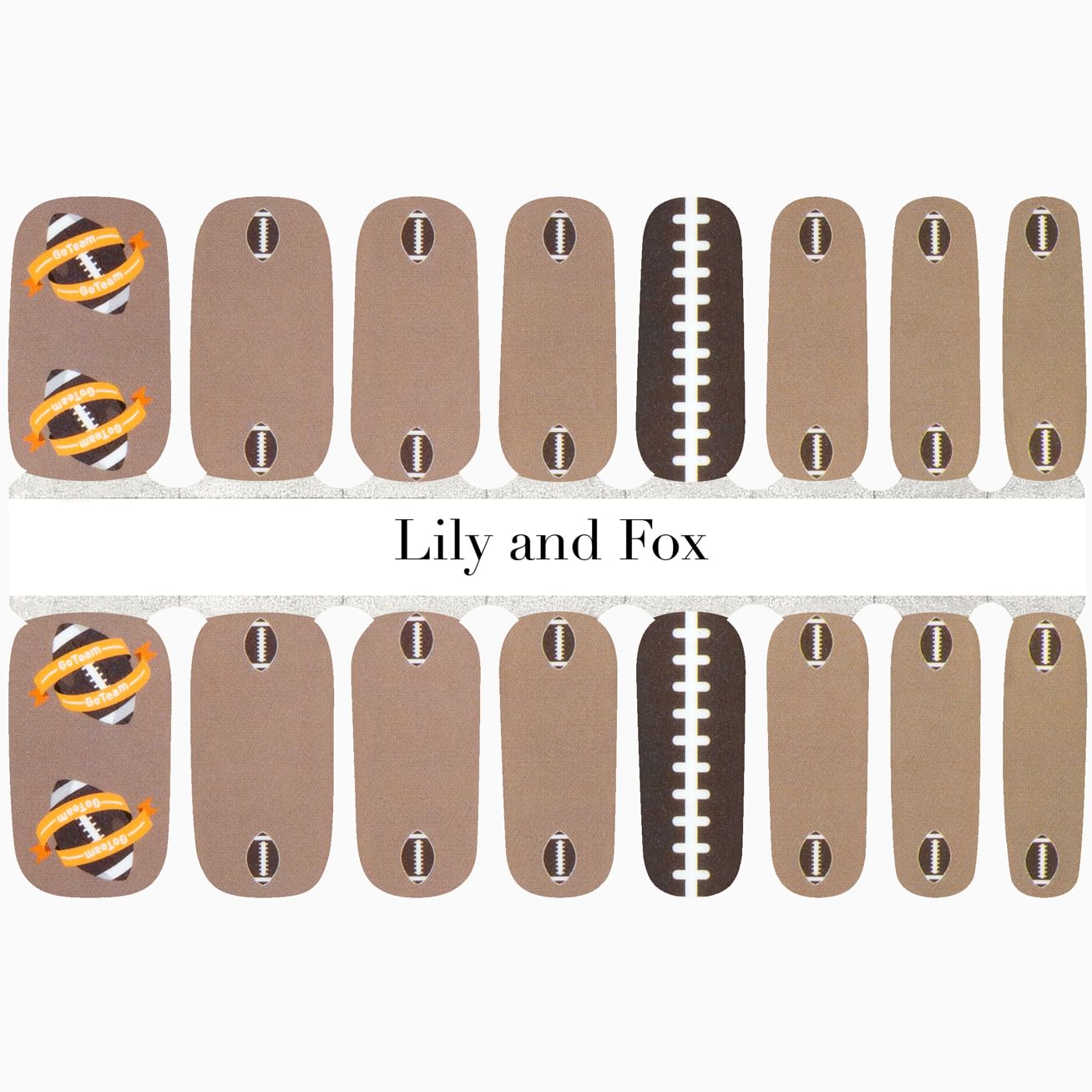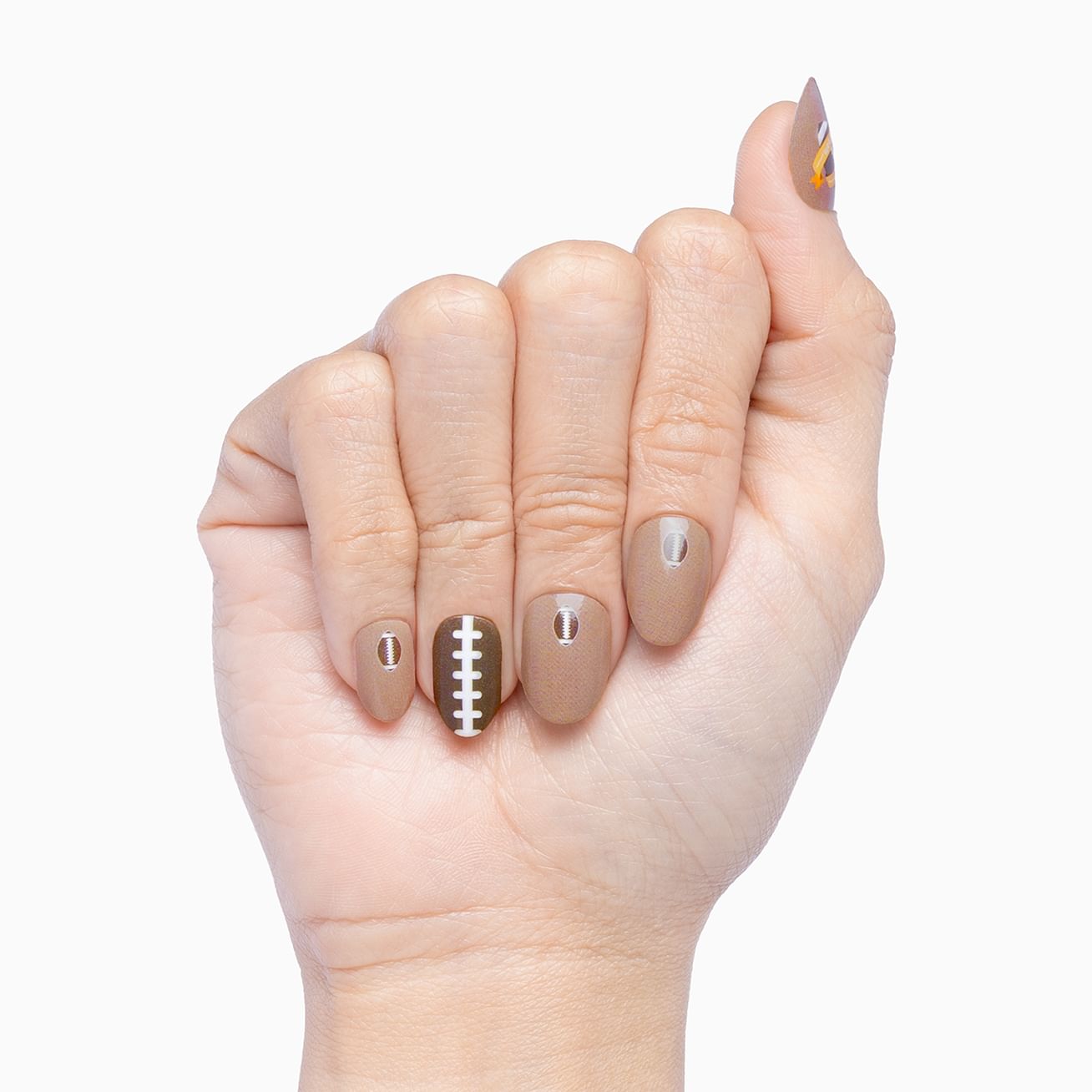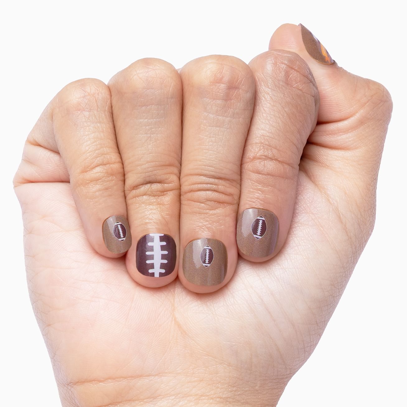 Half-Time! is the perfect manicure set for fans of American Football. Adorable as a set with an orange-banner-wrapped "go team" football on the largest-size wraps, a laced-up chocolate brown and white wrap, and six sizes featuring footballs at the cuticle set against a glossy mocha background. Wear on its own or mix and match to show your support for your favorite teams. Top it off with layer of top coat to send this manicure into overtime.